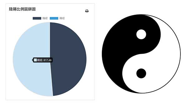 雲端網路版所提供的陰陽比例,將體內所有「屬陰」、「屬陽」的經絡數值分別加總,製作成為一個數值。若將滑鼠移到圖形上,就會呈現該數值的能量數值,非常方便。透過圓餅圖可以輕易地從圓區塊大小看出陰陽的比例,以下面這張圖為例,任何人用肉眼就可以清楚看出此人體內「陰大於陽」,從下面的數值顯示,屬陰的能量數值是 995.25,屬陽的能量數值是 862.31,陰經明顯大於陽經,因此陰陽比例是 1.15。