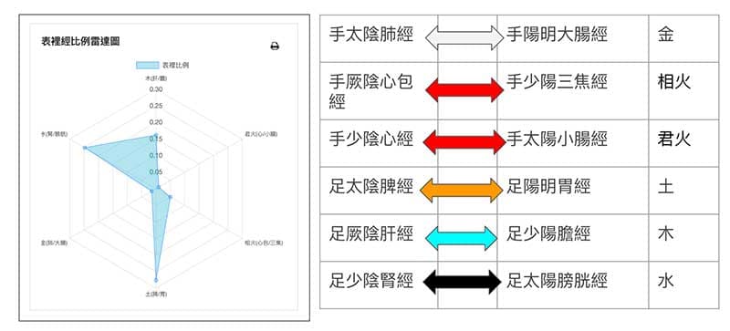 雲端中醫經絡檢測雲端版本,提供「表裡經比例雷達圖」,這張圖透過軟體程式,即時比較一對表裡經絡的數值差距。