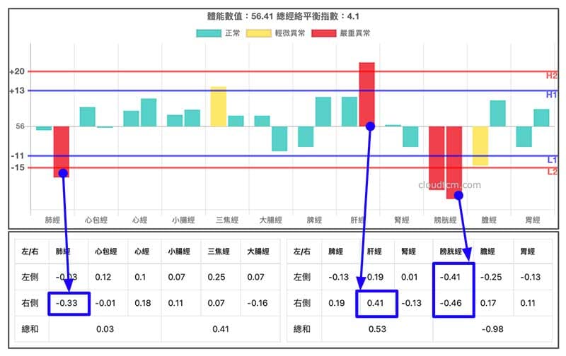 以下圖肝經右側為例,數值0.41,代表肝經原始數值經過校正參數之後,與體能數值的差異百分比是41%,數值為正,代表高於體能數值41%。