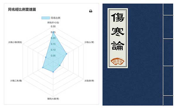 六經能量圖,直接看到六經的數值現象,有機會破解傷寒論的秘密! 例如,某人透過同名經雷達圖分析之後,發現太陽經有明顯差異的現象,太陽經能量太強或太弱,同時伴隨有脈浮、頭痛、脖子痛、惡寒發熱、腰痛現象,我們或許可以應用傷寒論中治療太陽病的中草藥(麻黃湯、桂枝湯…等等),藉以來改善這些症狀。