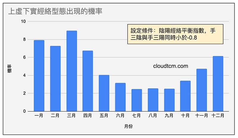 但是「上虛下實」,通常只會出現半年,另外半年通常會消失。下面這張圖,就是「上虛下實」經絡型態出現的機率,很明顯可以看到進入夏季之後明顯降低。