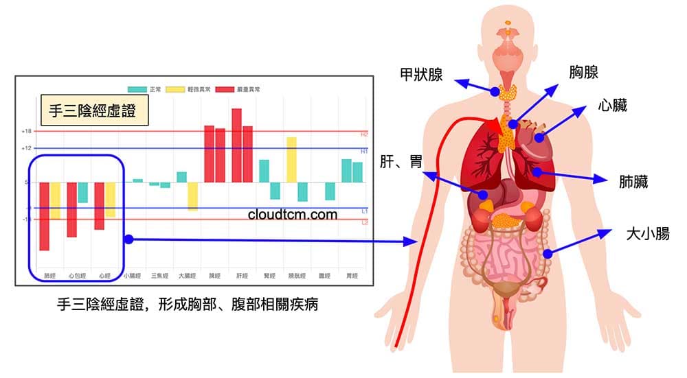 透過雲端中醫會員長期觀察後發現,手三陰經虛證容易出現:咳嗽、氣喘(爬樓梯會喘)、胸悶、胸痛、心悸、喉嚨發炎疼痛、胃腸不舒服(感覺胃部附近塞住)、胃食道逆流、便秘或腹瀉…等等症狀,每一種都有會員實際回報的案例。