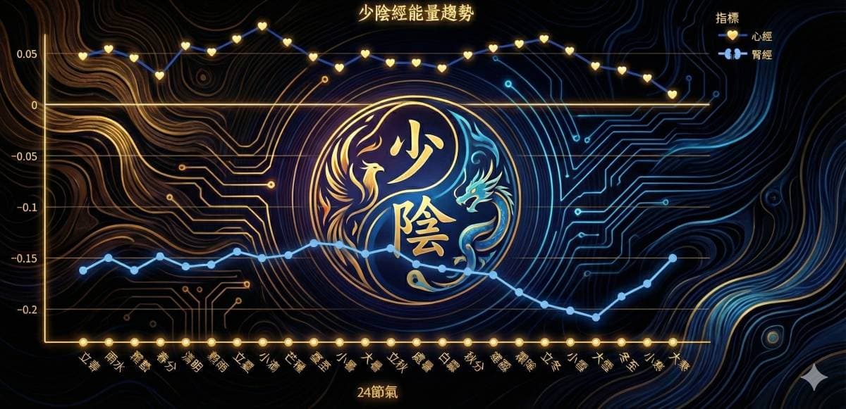 如果從「少陰經」(心經與腎經)的角度來看經絡能量變化看來,「少陰」系統展現出「心火常實、腎水常虛」的強烈對比,這精準反映了人體在節氣運行下的能量調控現象。
