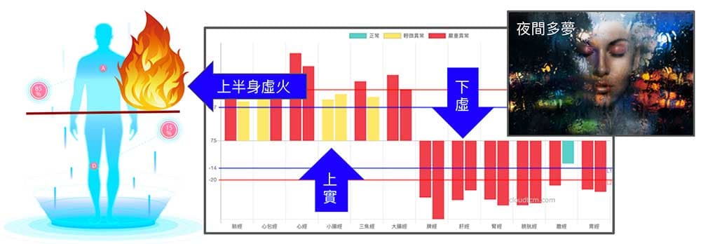 夜間多夢的經絡型態,常見於心經與脾經、腎經相關異常型態,鐵三角經絡型態,或是上實下虛經絡型態。