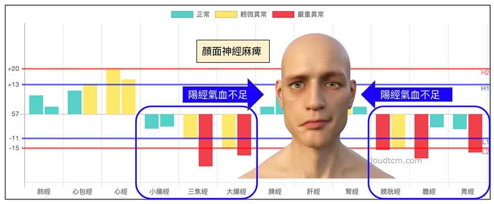 同時,在面癱出現之前,她長年非常怕冷,很怕吹到風,幾年前出現嚴重更年期障礙,數個月前還出現帶狀皰疹,這些背後的原因,都是源自於同一種經絡型態。