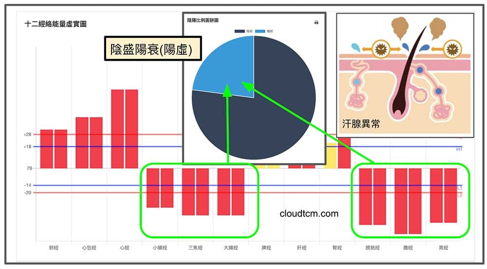 如果運用現代經絡檢測技術去觀察,會發現這類族群體內的陽經多數能量低下,直接印證所謂的「陽虛體質」不容易流汗確實是真的!